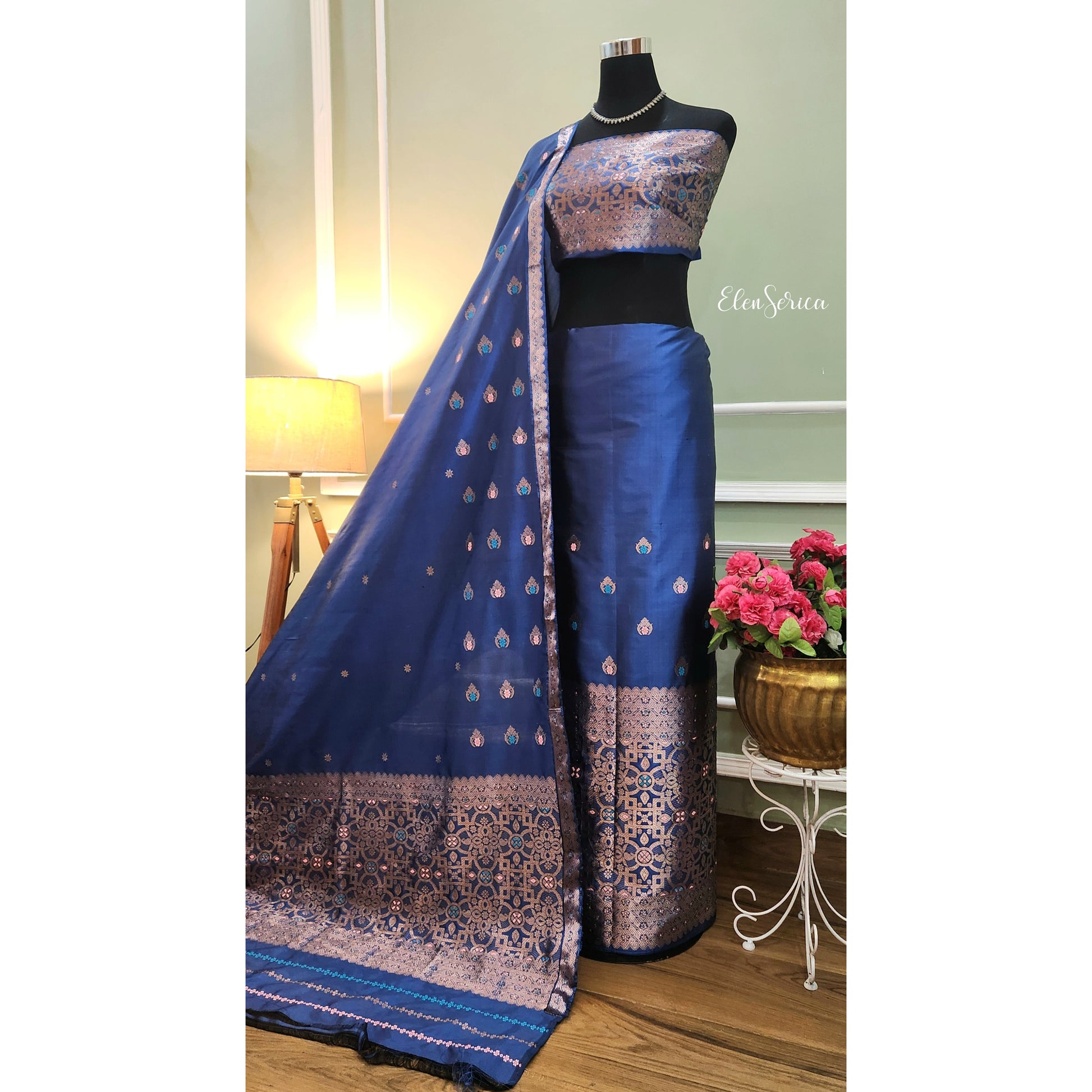Navy Blue Mulberry Silk (Paat) Mekhela Chador