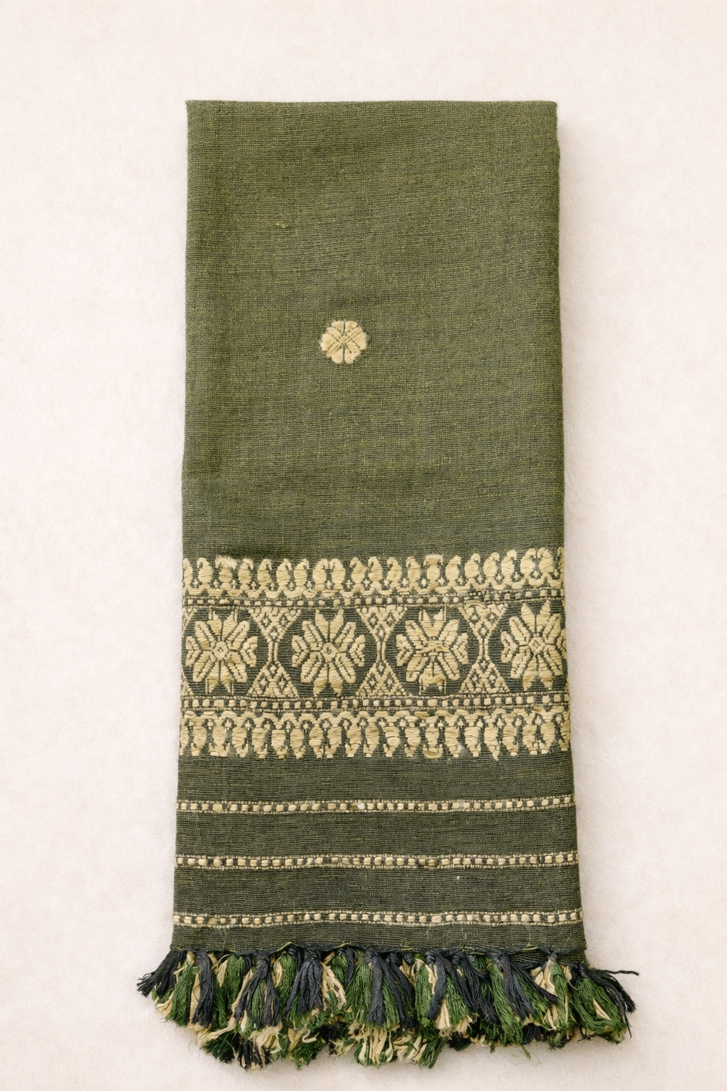Handwoven in authentic Assamese Eri Silk / Vegan Silk, the fabric is soft, breathable, and alive with a natural texture that only true handloom can offer. Its distinctive green tone is achieved using Neem leaves natural dye, applied slowly and thoughtfully to create organic depth and subtle tonal variations. Delicate motifs are woven using Muga Ghisa thread, adding a gentle contrast that highlights the finesse and patience of skilled artisans.